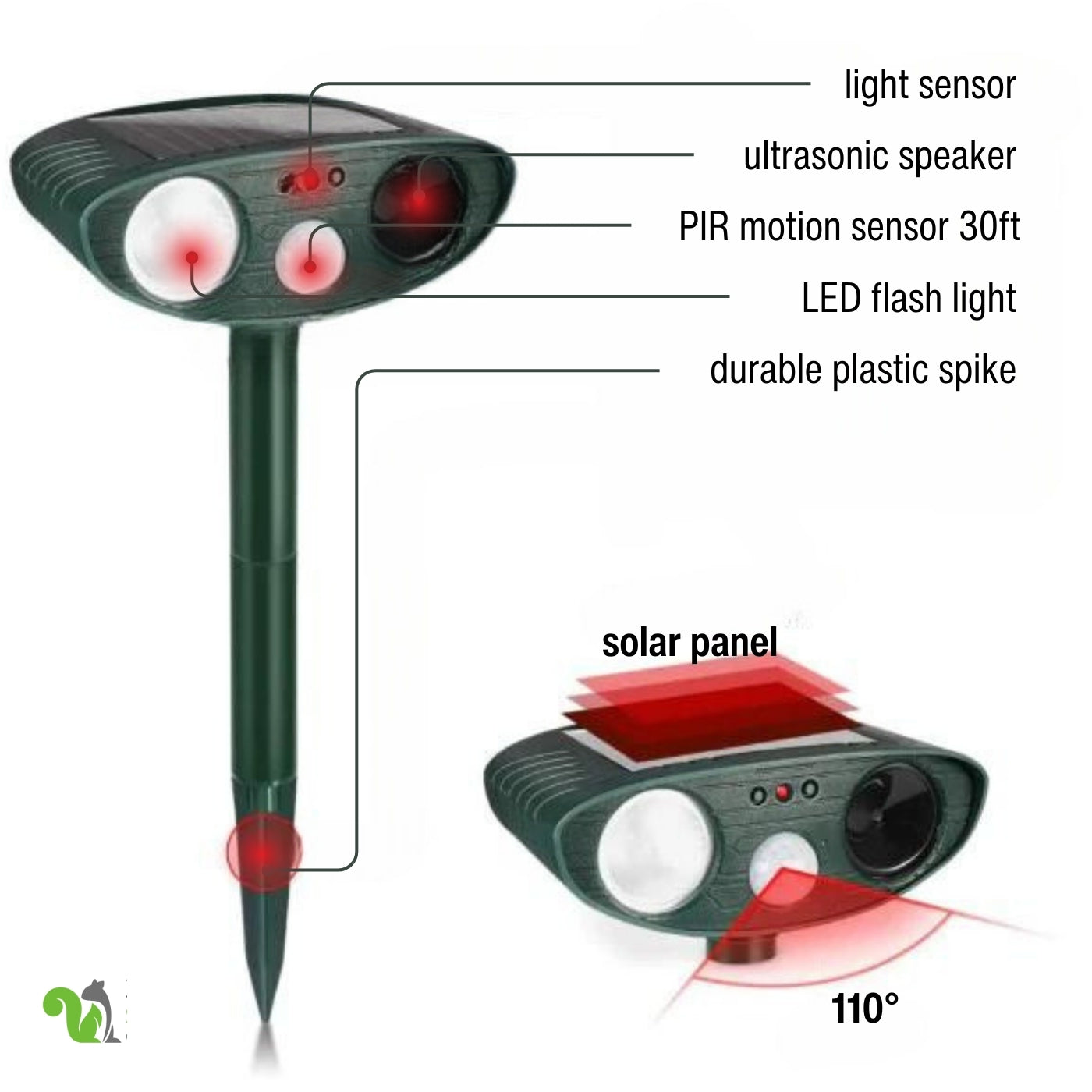 1️⃣ Detects Movement – The built-in motion sensor activates when squirrels enter the protected zone.